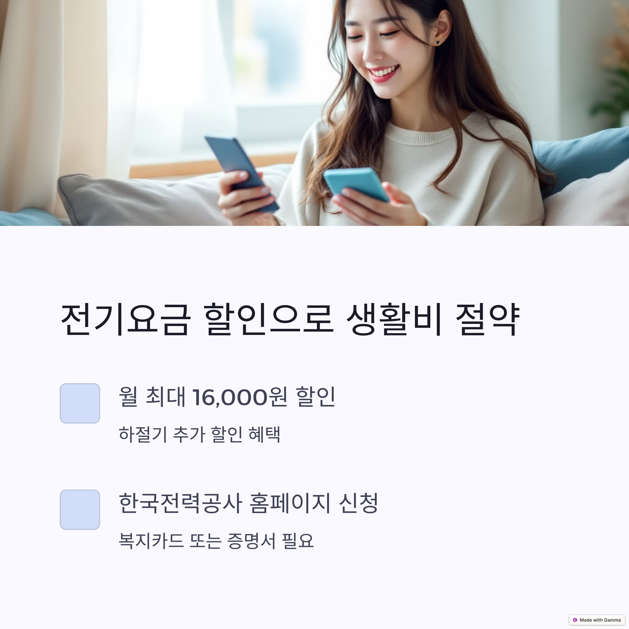 - 신청 방법: 동주민센터 또는 한전 고객센터(☎ 123)