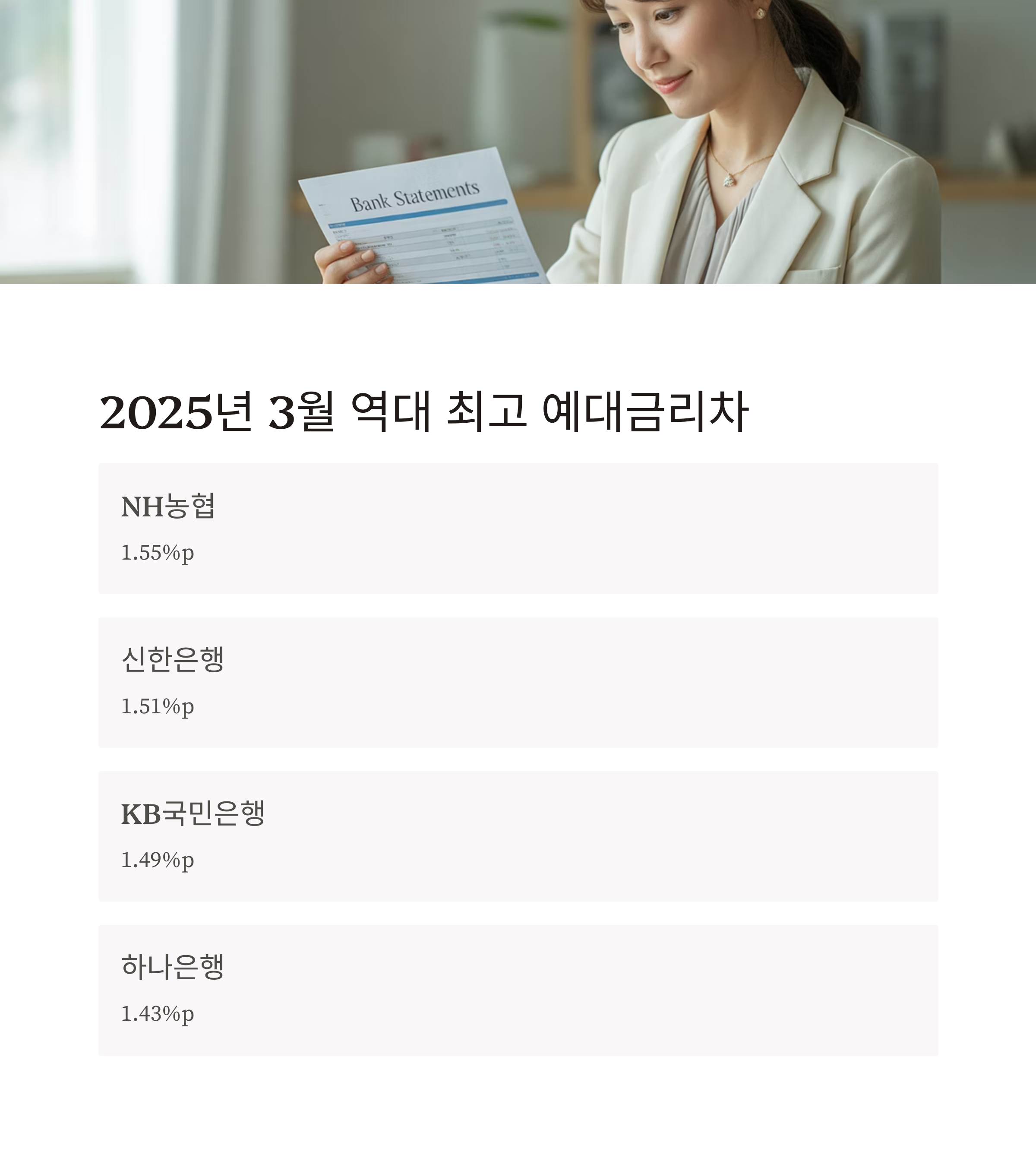 2025년, 국내 주요 은행들의 예대금리차(대출금리 - 예금금리)가 사상 최고 수준으로 벌어졌습니다. 기준금리는 내려가고 있지만, 대출금리는 유지되거나 상승하고 있고, 예금금리는 빠르게 떨어지고 있는 상황, 그 결과 서민들의 금융 부담은 급증하고 있는데요. 예대금리차 확대의 배경과 영향,그리고 앞으로의 정책 전망과 대응 전략까지 꼼꼼하게 짚어보겠습니다.