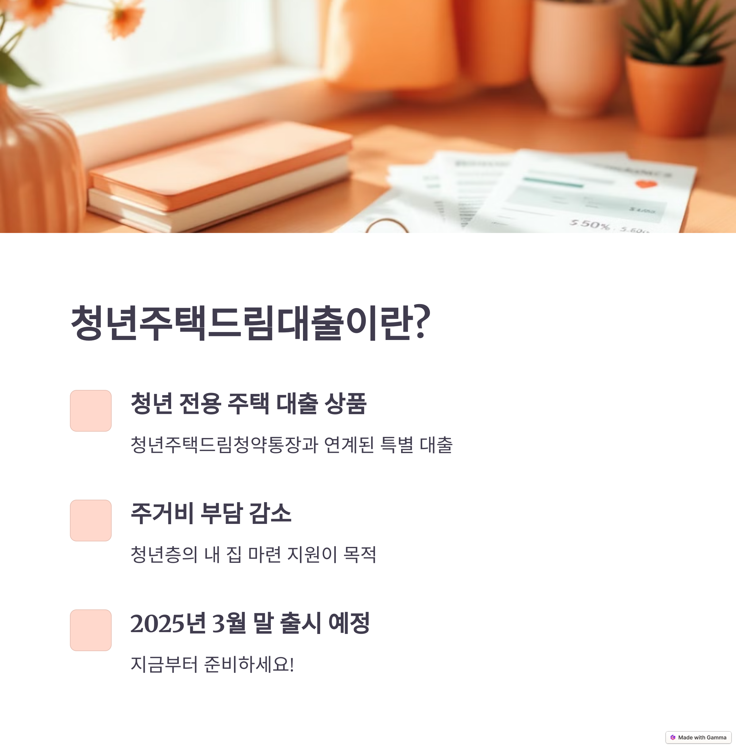 국토교통부에서 2025년 3월 말, 청년층의 주택 구입을 지원하기 위해 청년 주택드림 대출을 출시합니다.