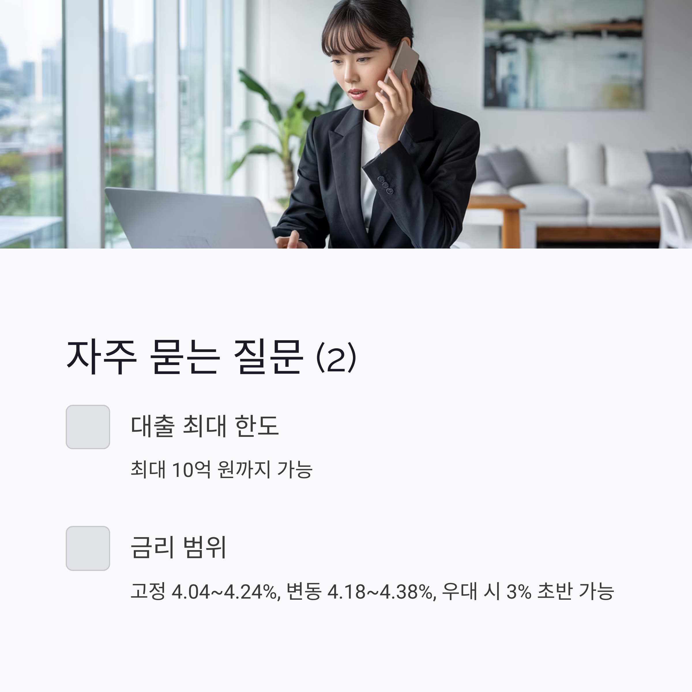 A4. 고정 4.04~4.24% 변동금리 4.18~4.38%이며, 우대 적용 시 3% 초반 가능성도 있습니다.