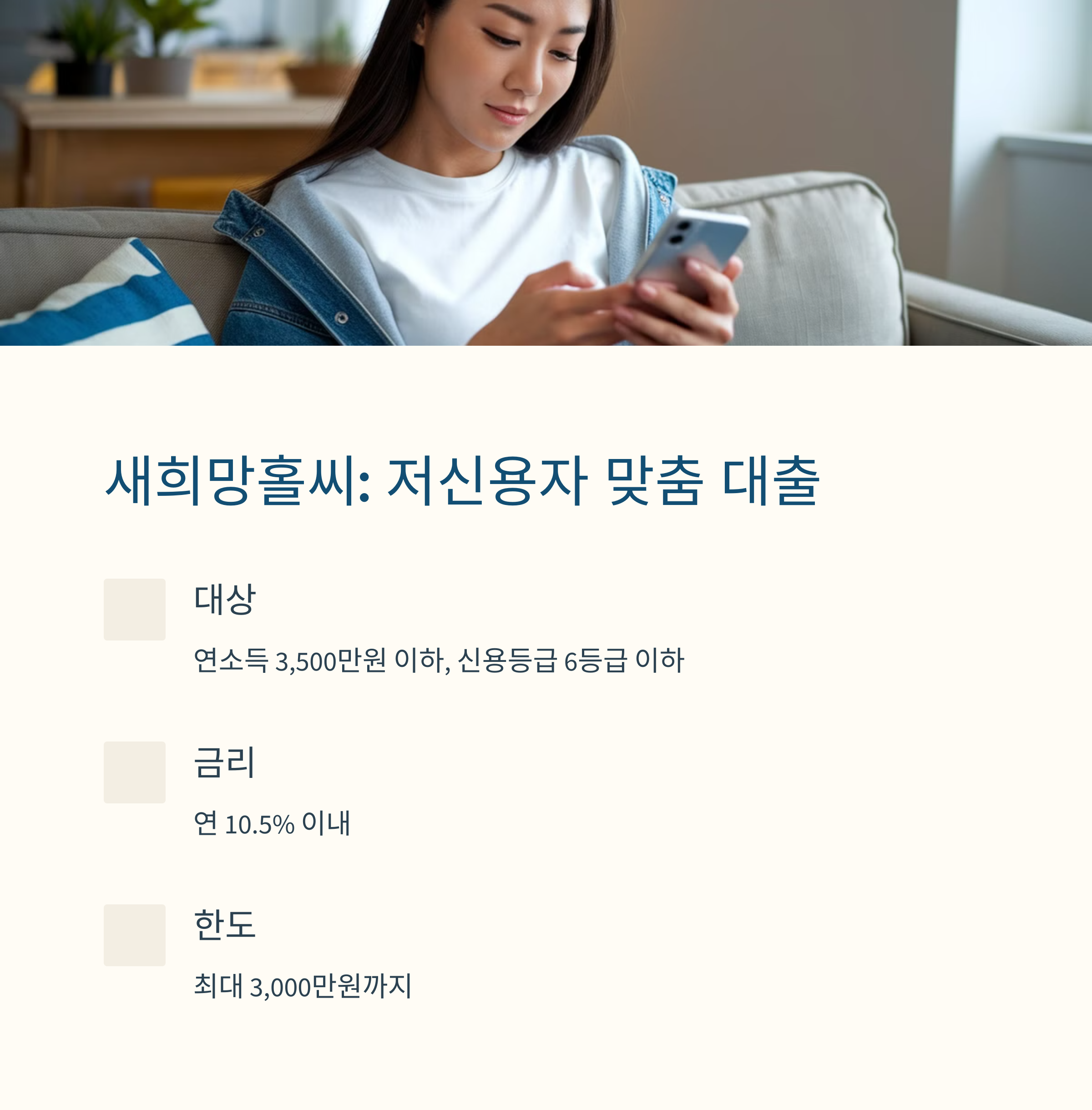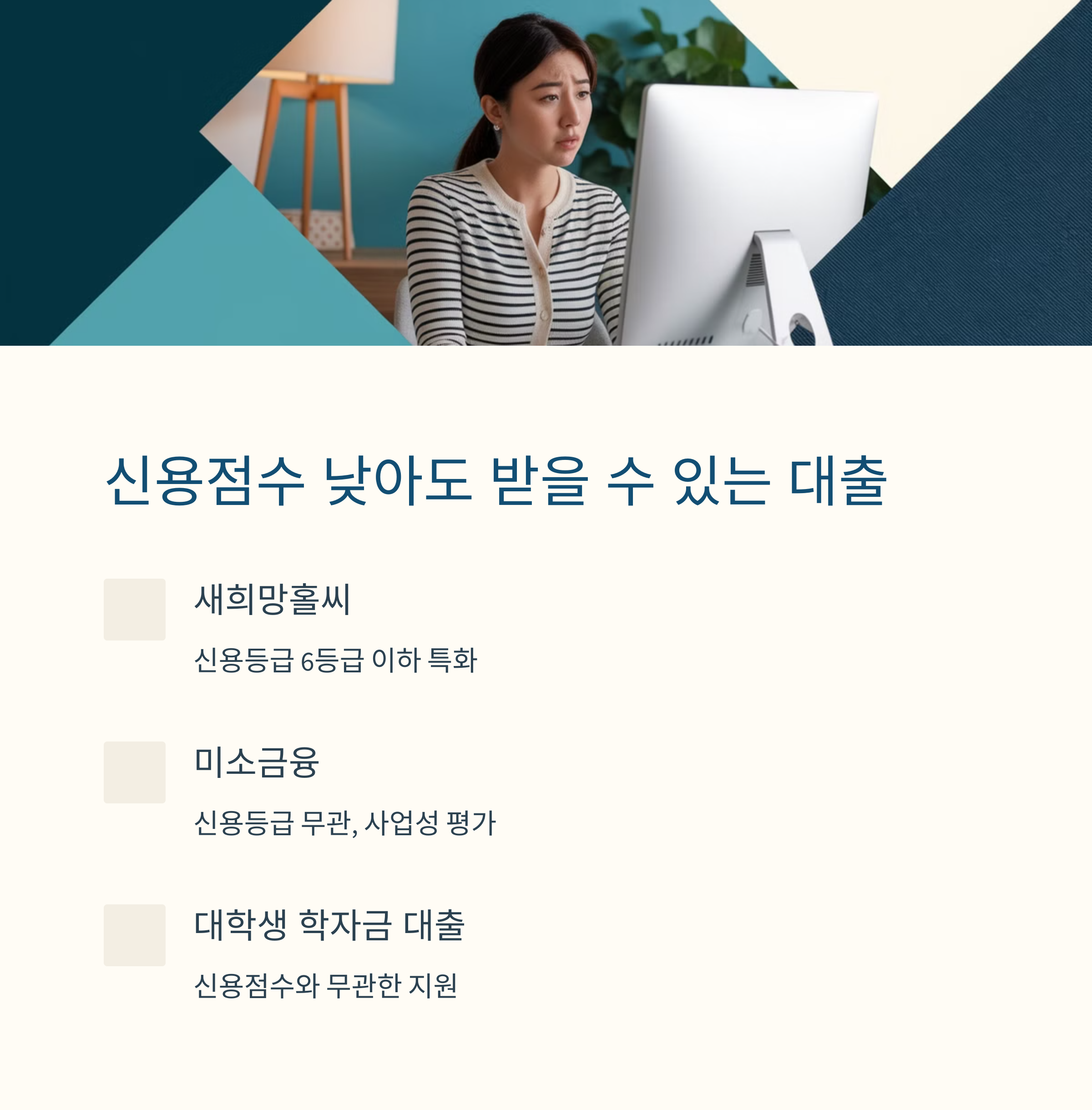 A4. 일부 대출은 신용등급이 낮아도 신청할 수 있습니다. 예를 들어, 햇살론, 미소금융 취업 성공 대출은 신용점수가 낮아도 가능합니다