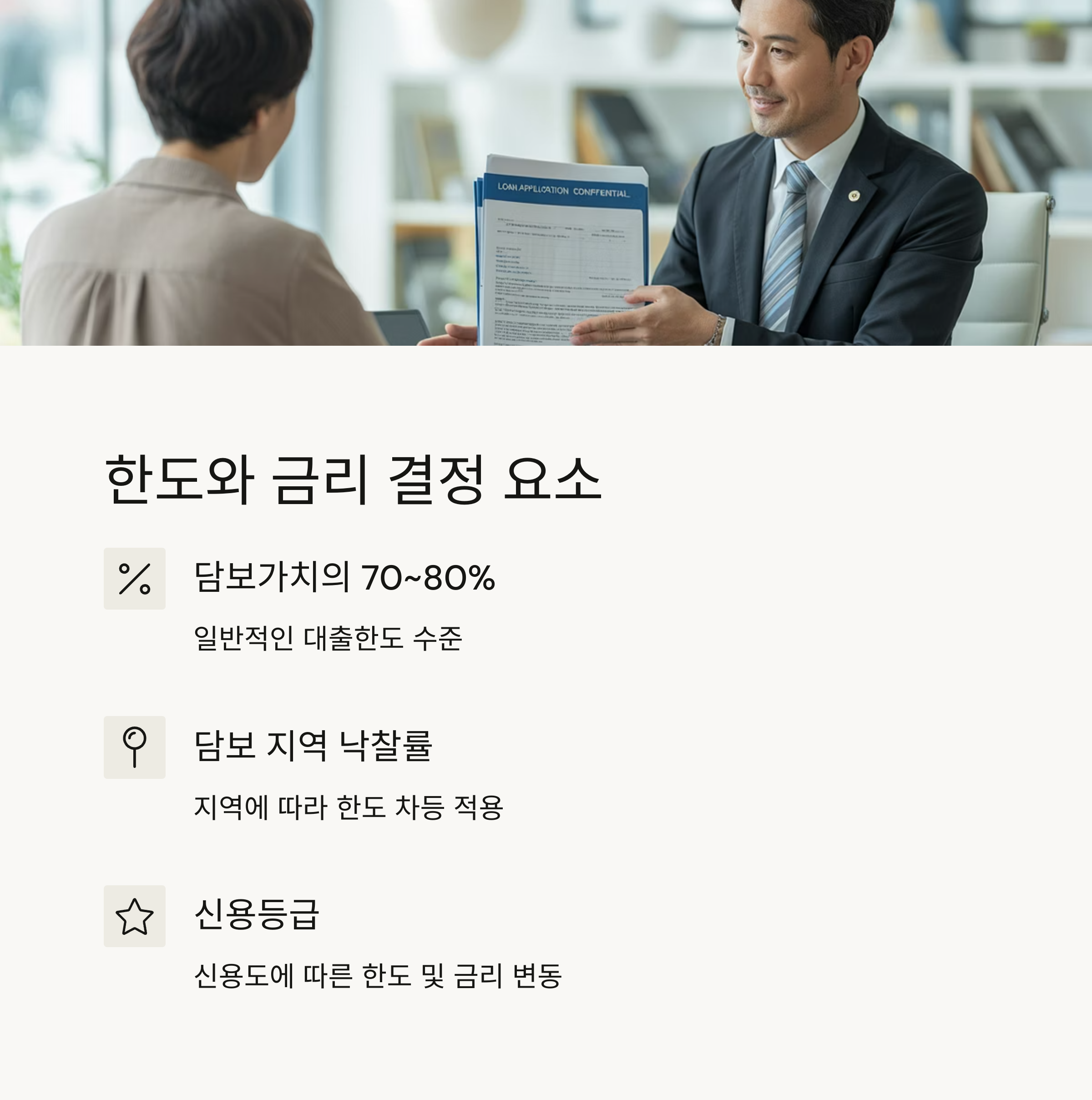 대출한도는 보통 담보가치의 70~80% 수준입니다. 하지만 금융기관마다 기준이 다르며,