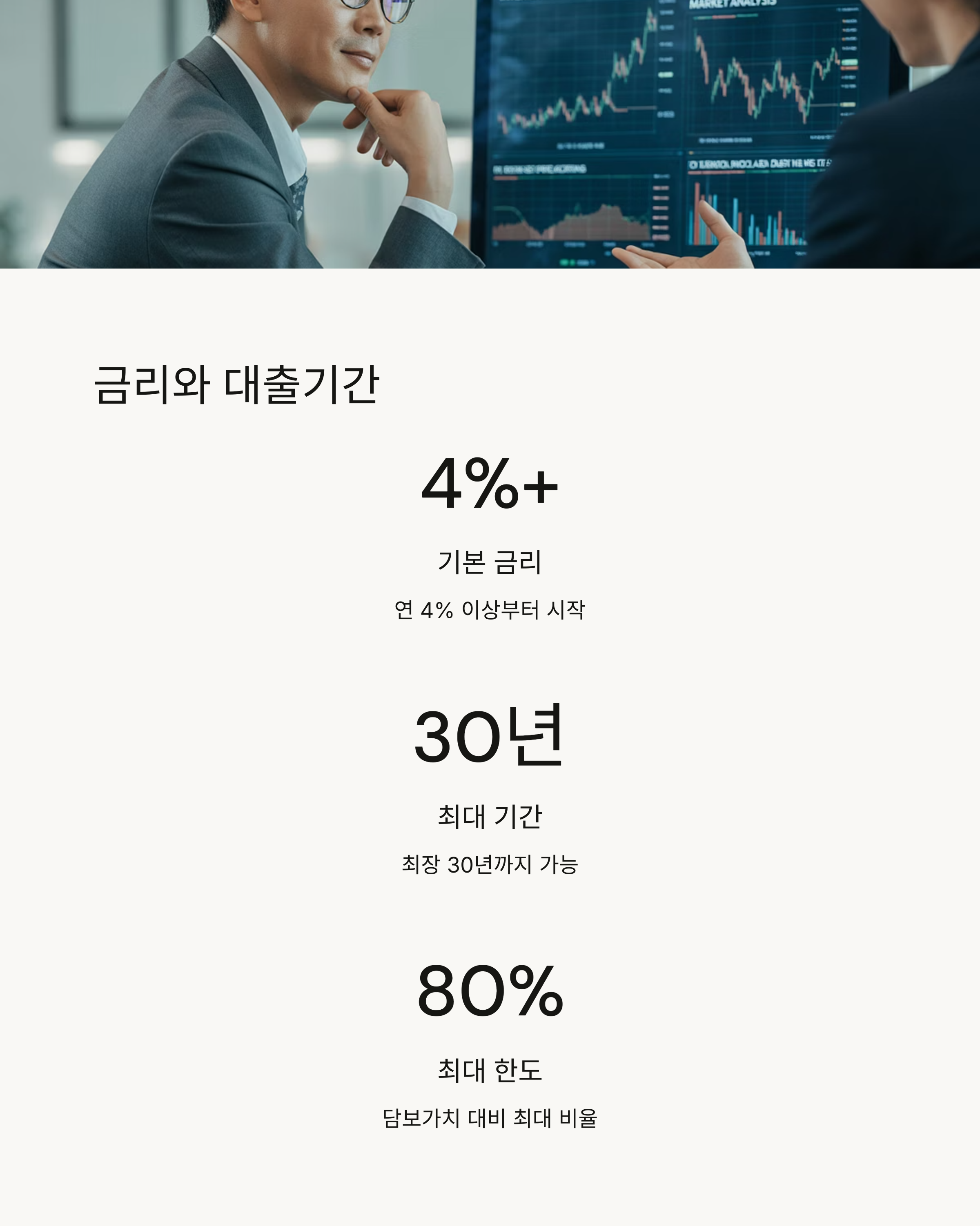 금리는 연 4%~, 대출기간은 최대 30년까지 가능합니다.