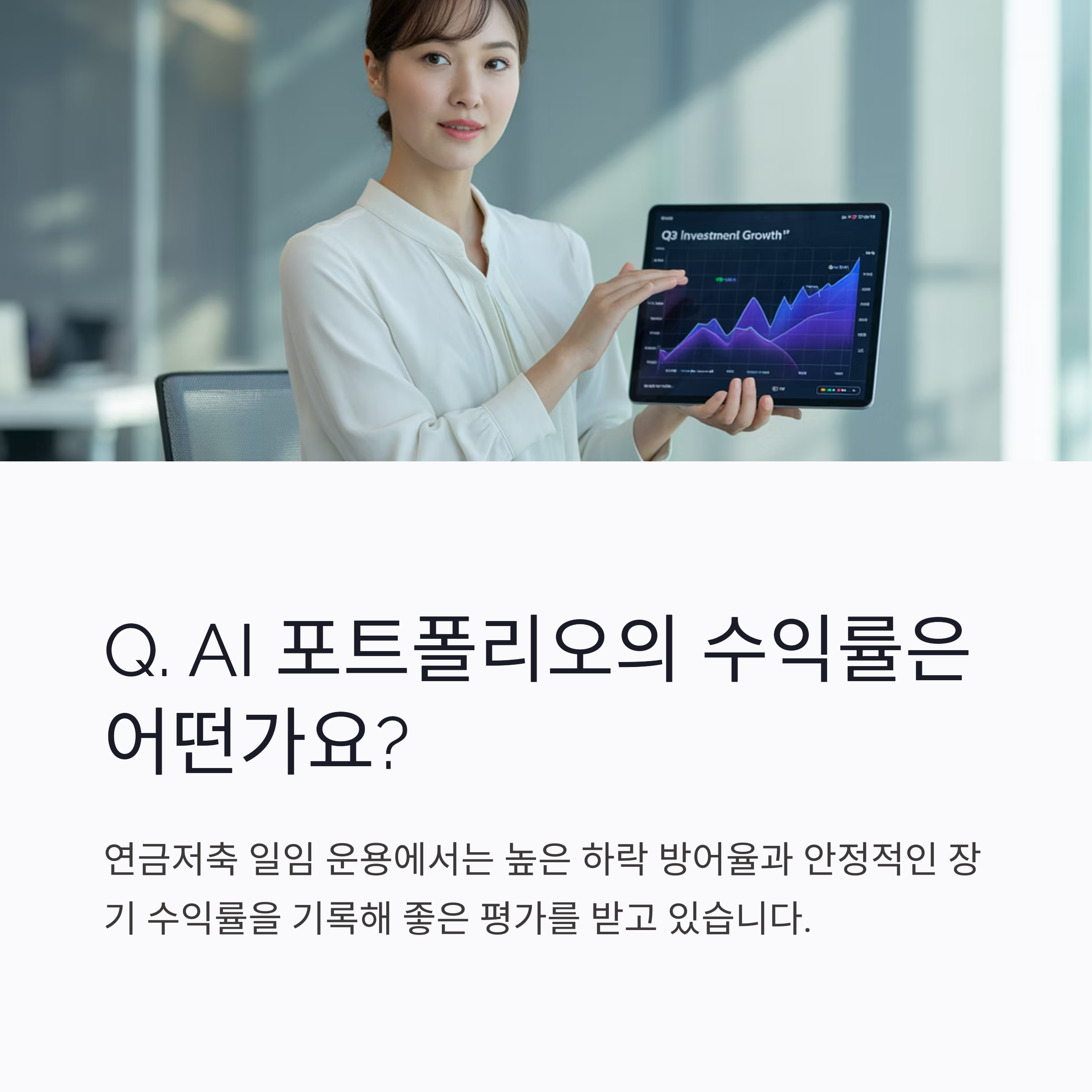 A3. 연금저축 일임 운용에서는 높은 하락 방어율과 안정적인 장기 수익률을 기록해 좋은 평가를 받고
