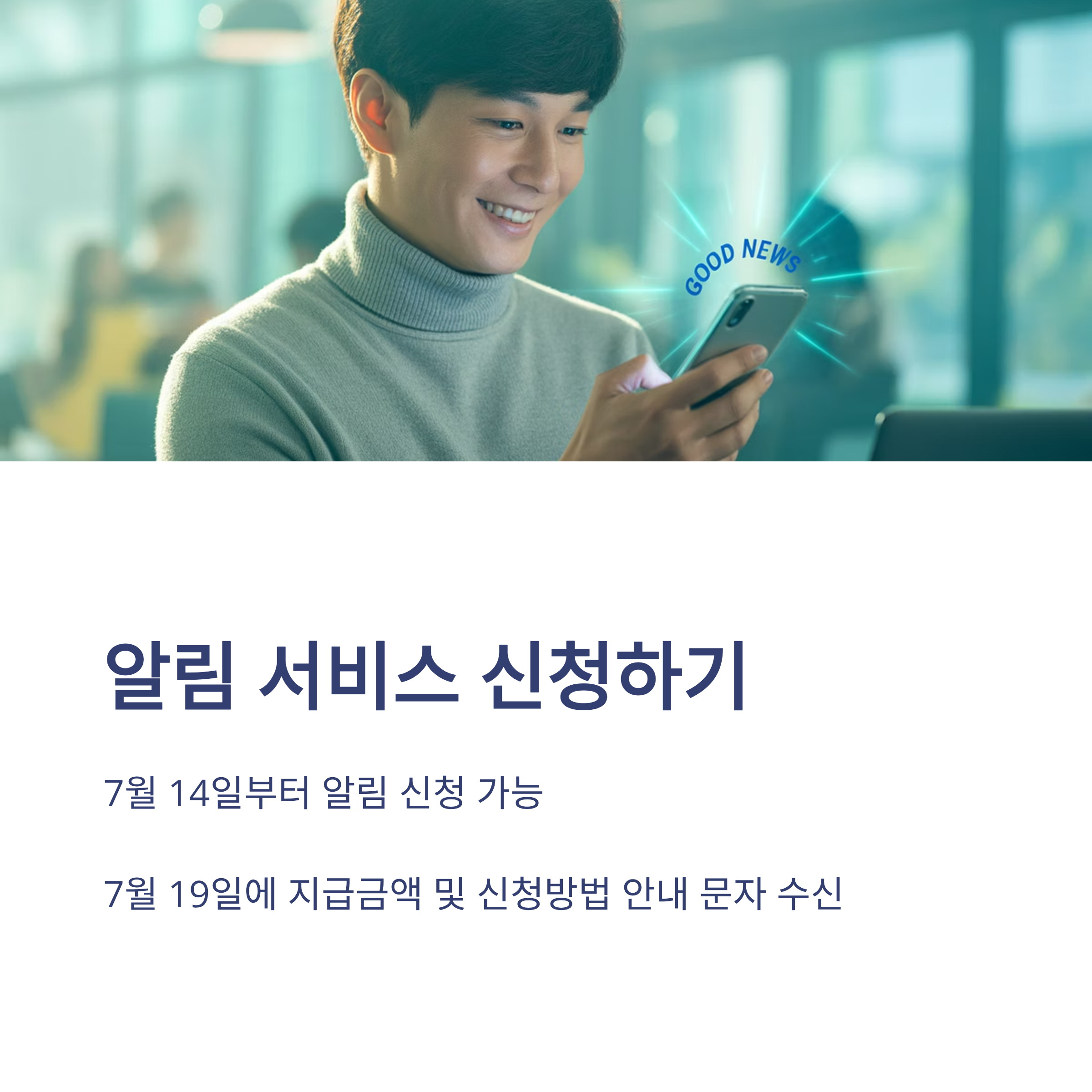 7월 14일부터알림 신청 가능 7월 19일에 지급금액 및 신청방법 안내 문자 수신