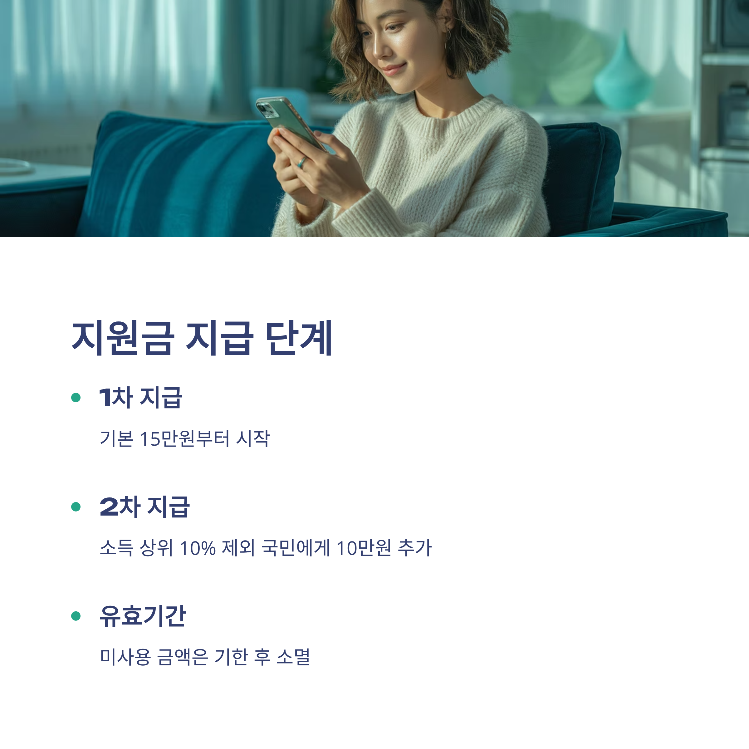 ✅ 1차 지급: 기본 15만원부터 시작 ✅ 2차 지급: 소득 상위 10% 제외한 국민에게 10만원 추가 ✅ 소비촉진형 정책: 유효기간 내 미사용 금액은 소멸