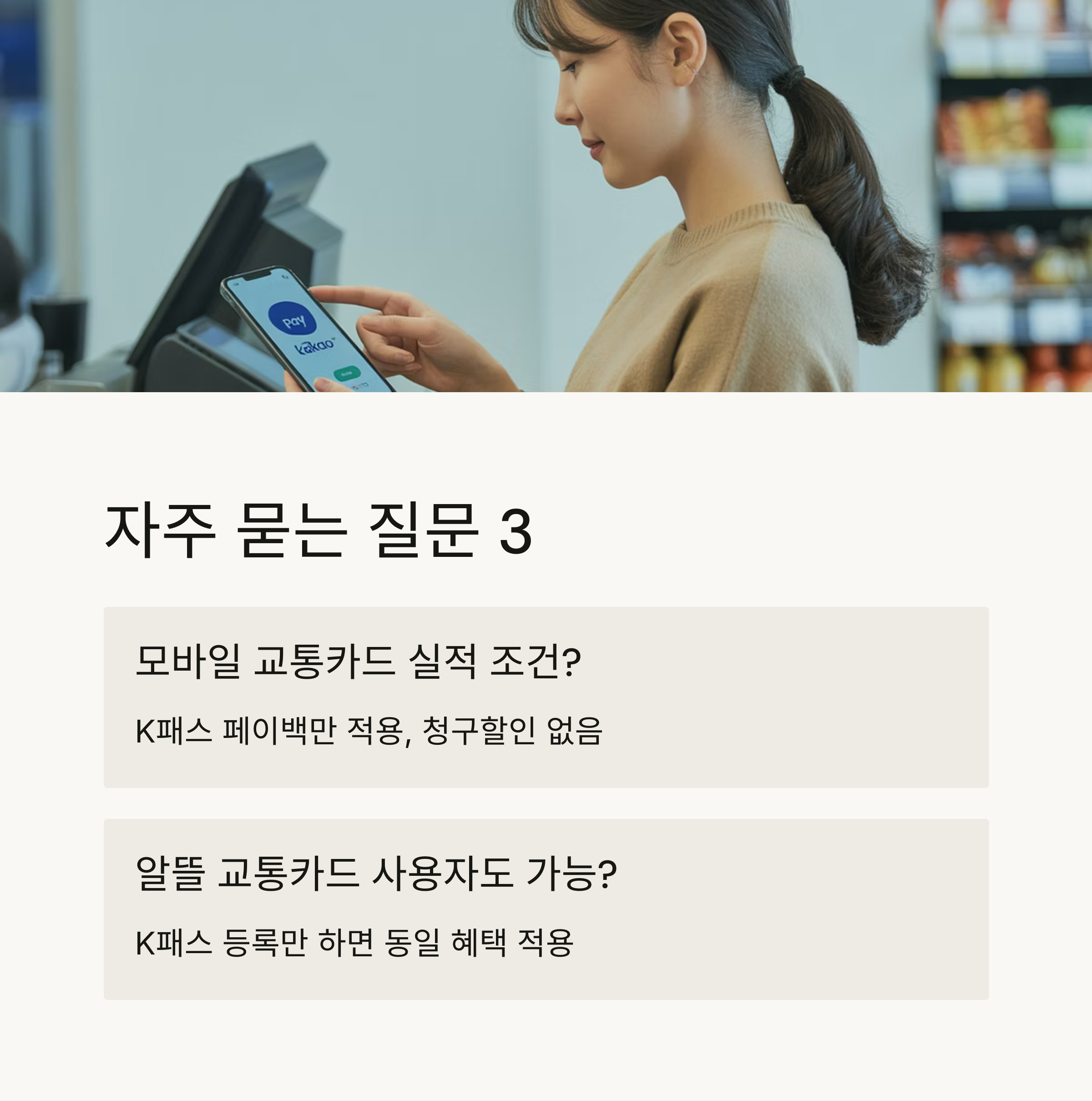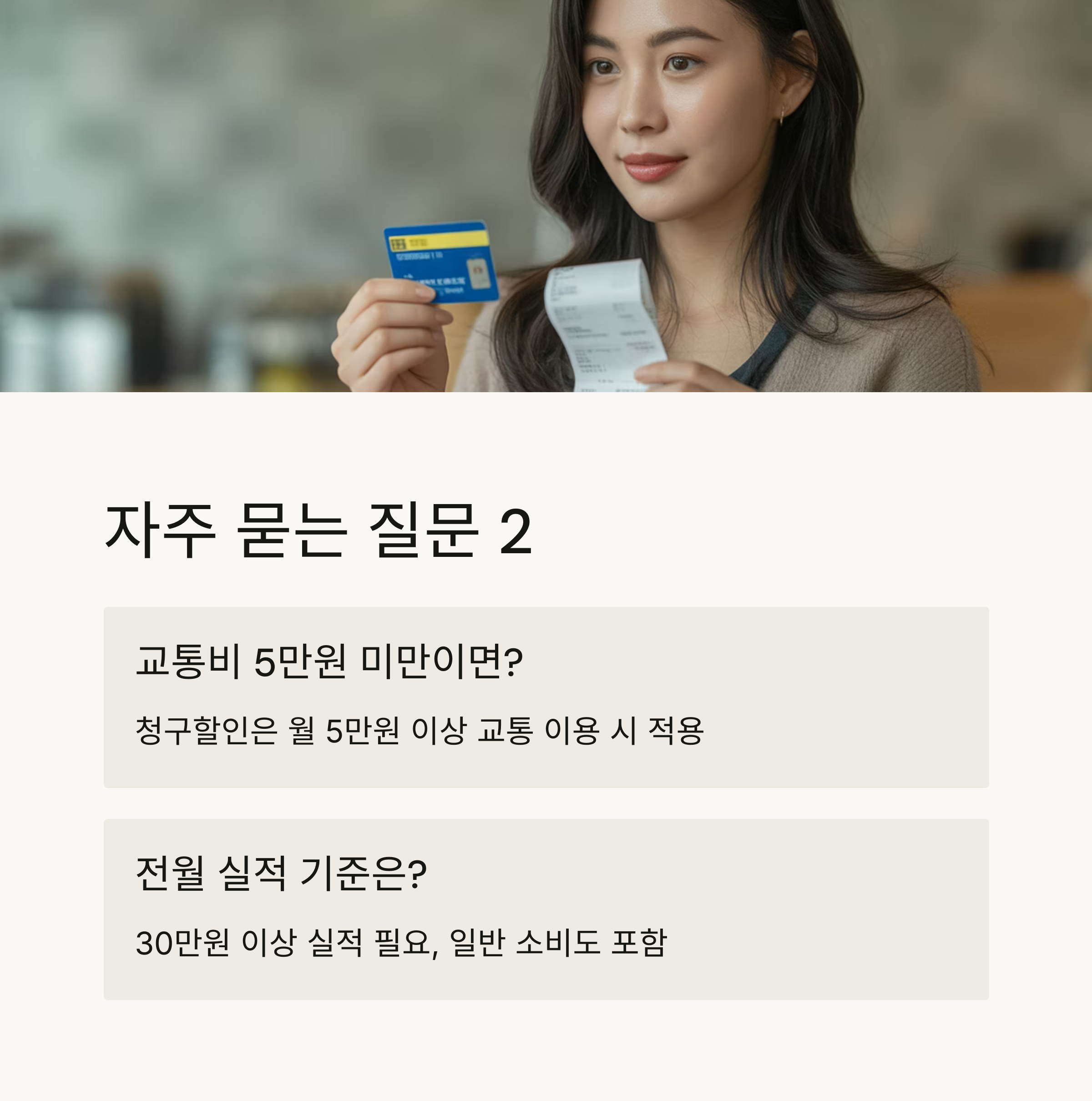 A4. 30만 원 이상 실적을 충족해야 청구할인을 받을 수 있습니다. 교통비뿐 아니라 쇼핑, 배달 등 일반 소비도 포함됩니다.