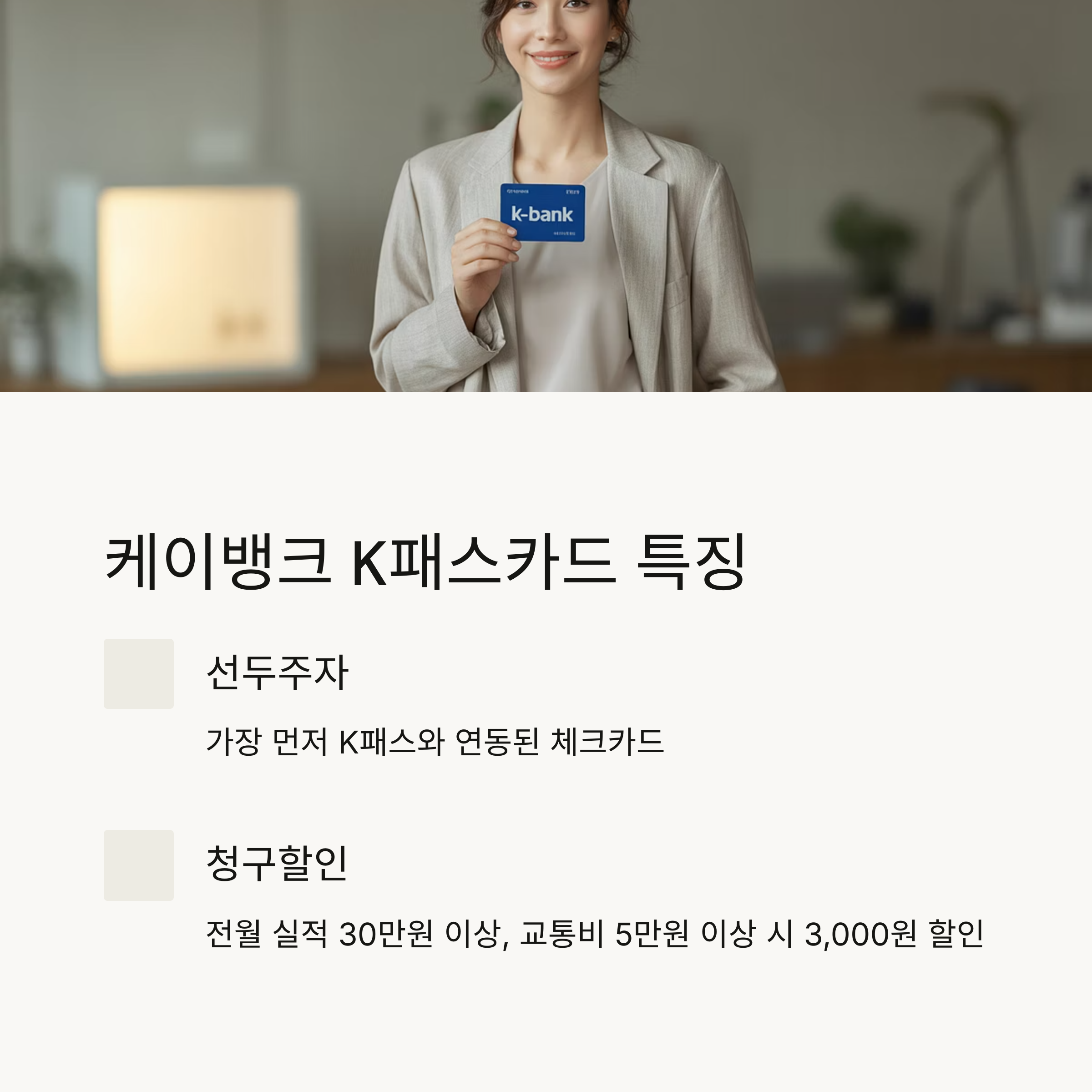 케이뱅크의 K패스카드는 가장 먼저 K패스와 연동된 체크카드로, 전통적인 교통카드 사용자에게 익숙한 형태입니다.