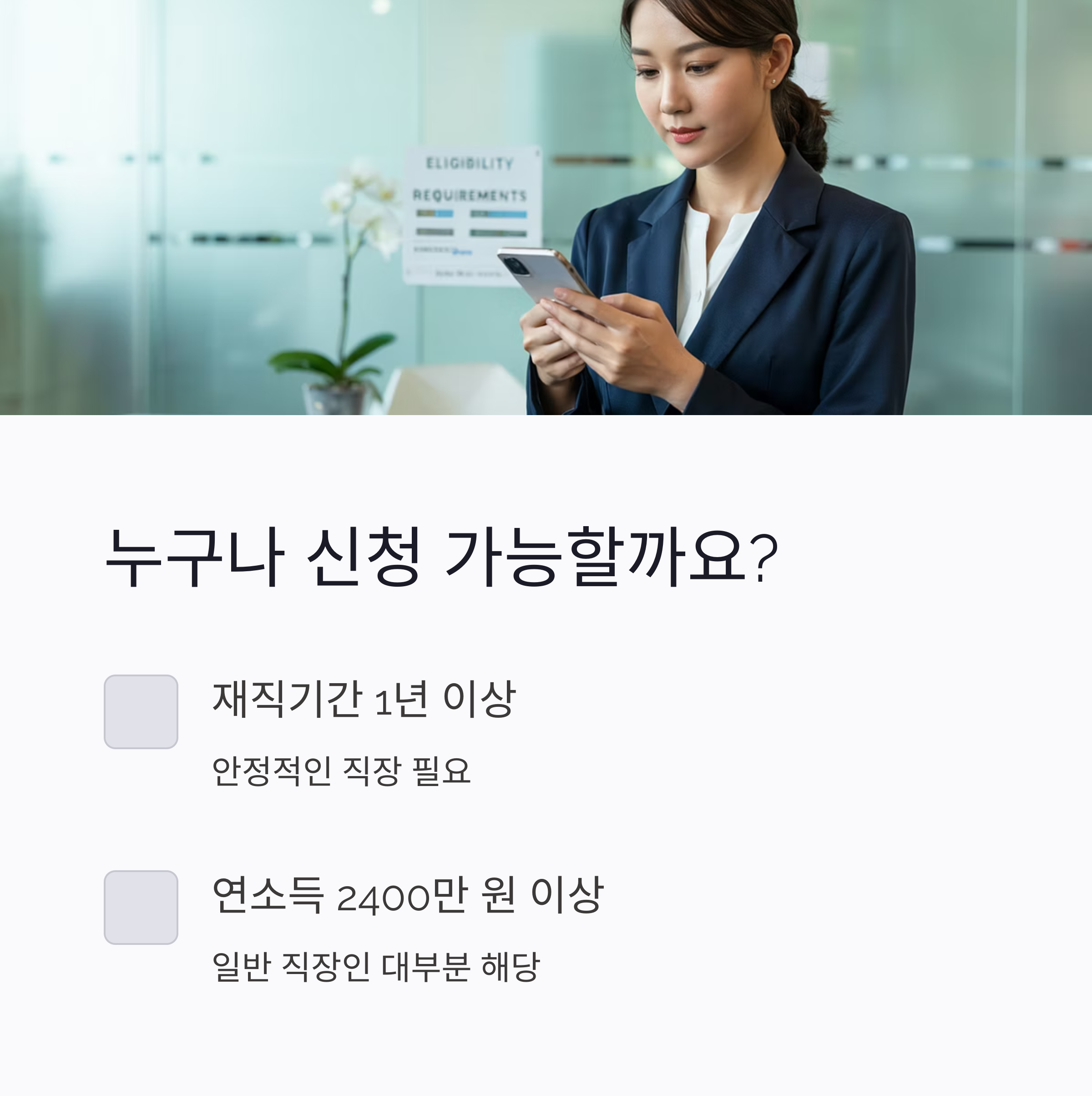 A1. 재직 1년 이상, 연소득 2400만 원 이상 근로자면 신청할 수 있습니다.