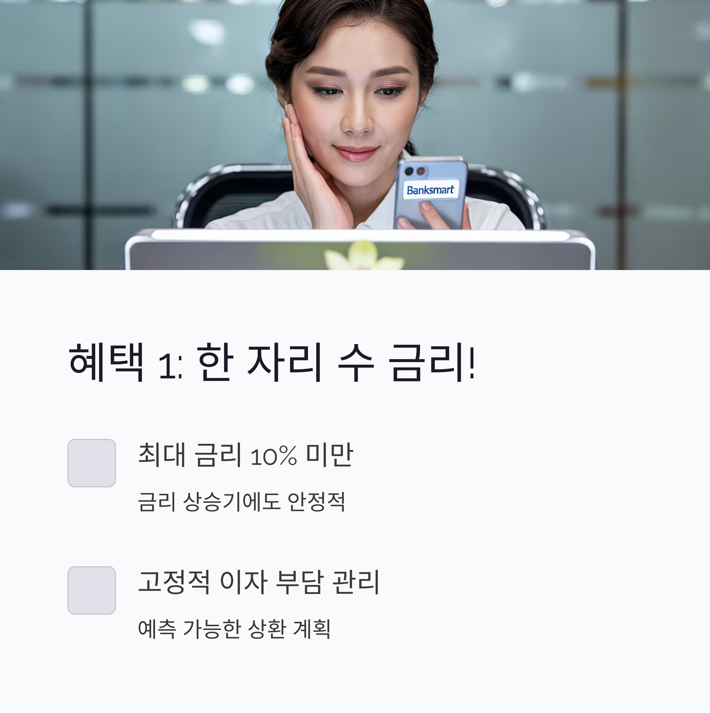 A6. 금리가 한 자리 수로 제한되어 있어 기준금리가 오르더라도 부담이 적습니다.