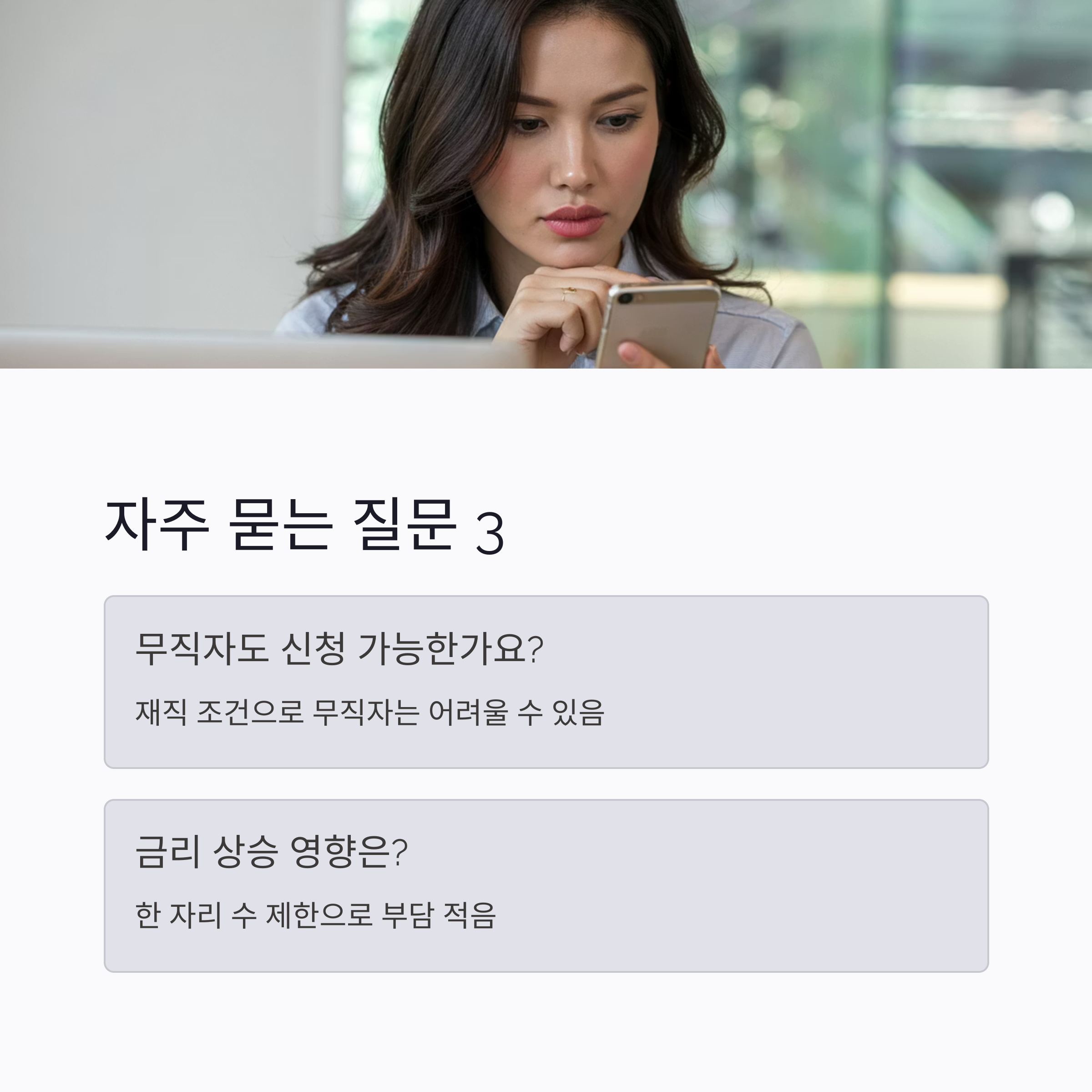 A5. 기본 요건이 재직기간 1년 이상, 연소득 2400만 원 이상이라 무직자는 어려울 수 있습니다.