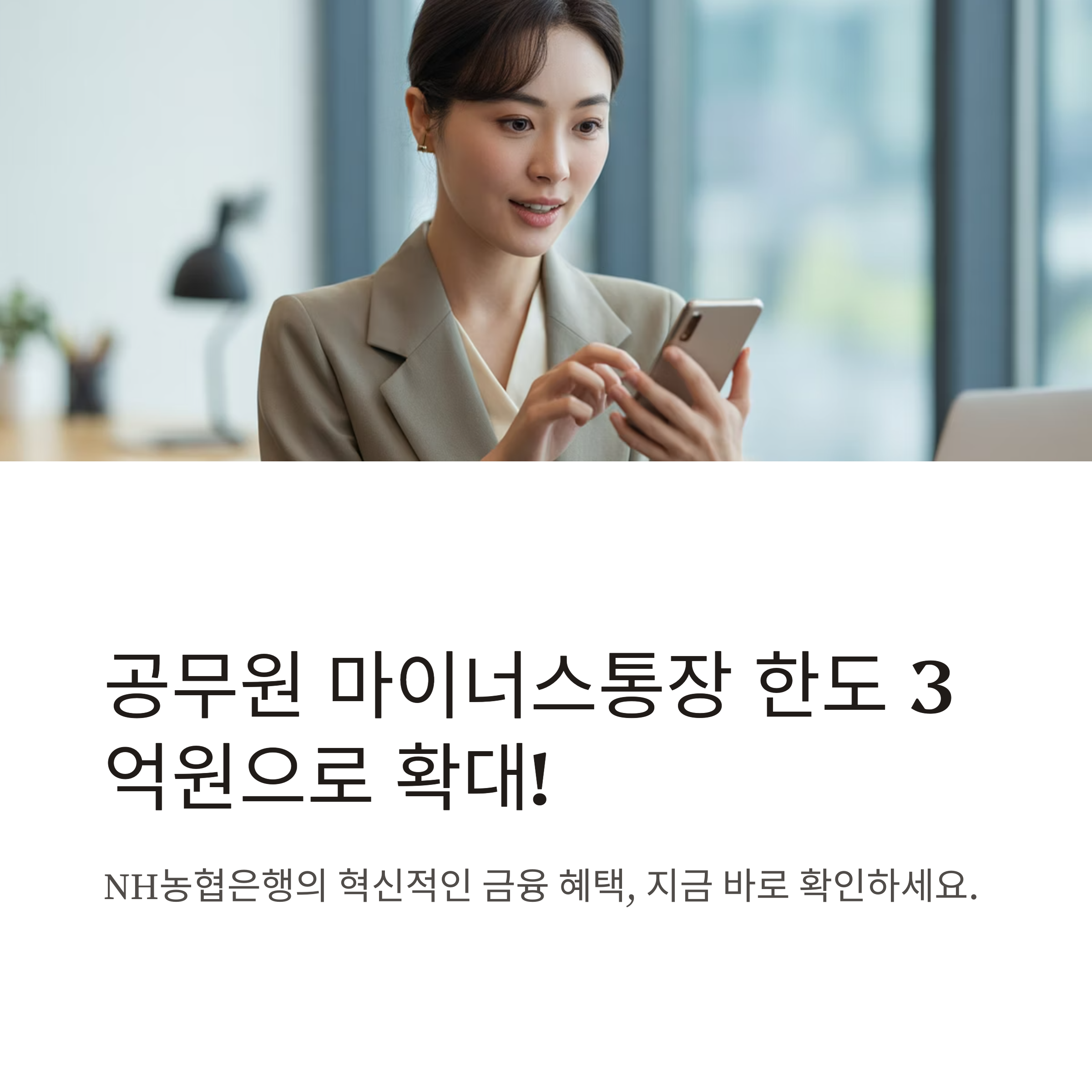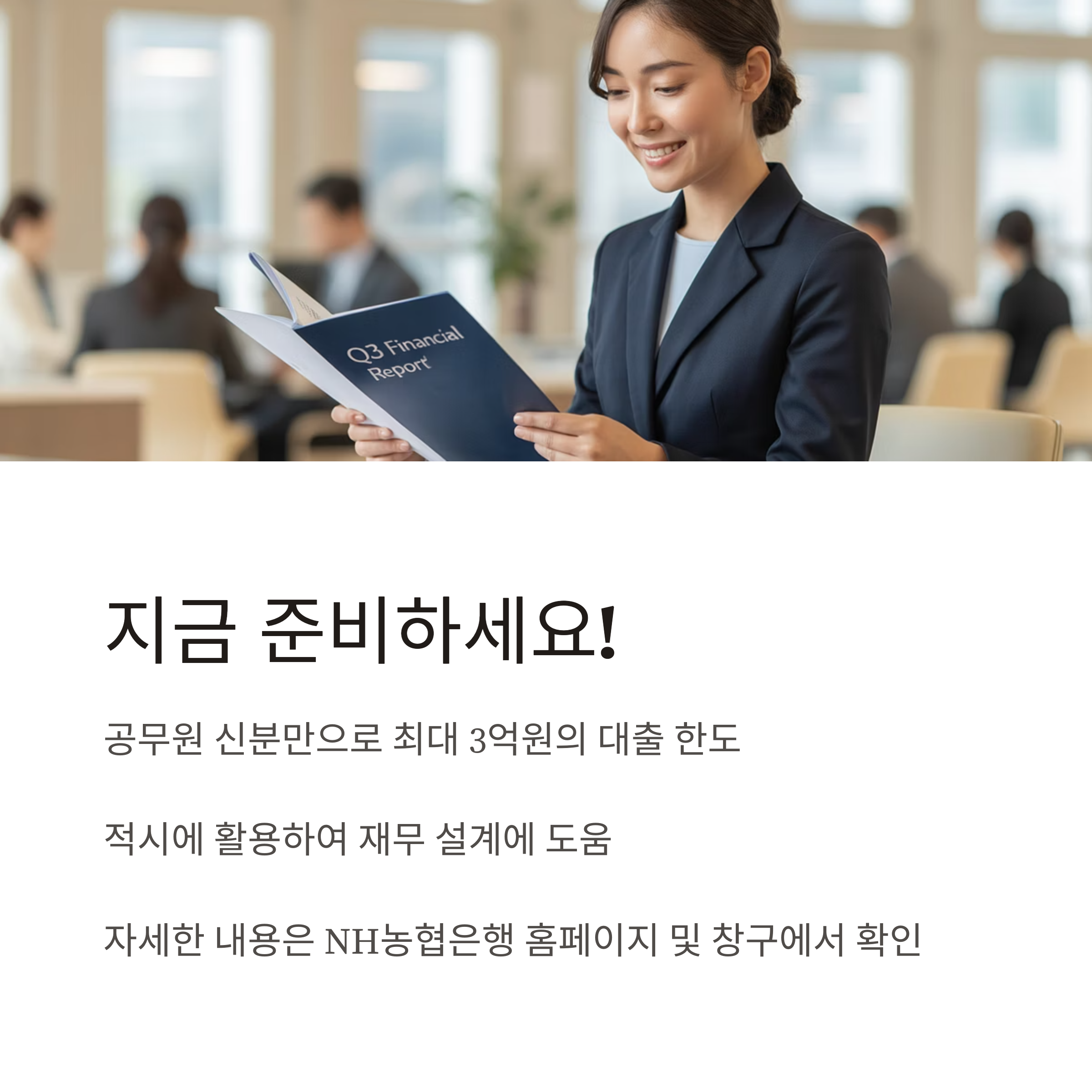 NH농협은행이 운영 중인 ‘NH공무원대출’ 상품의 마이너스통장 대출 한도가 2025년 연내 최대 3억원까지 확대됩니다.