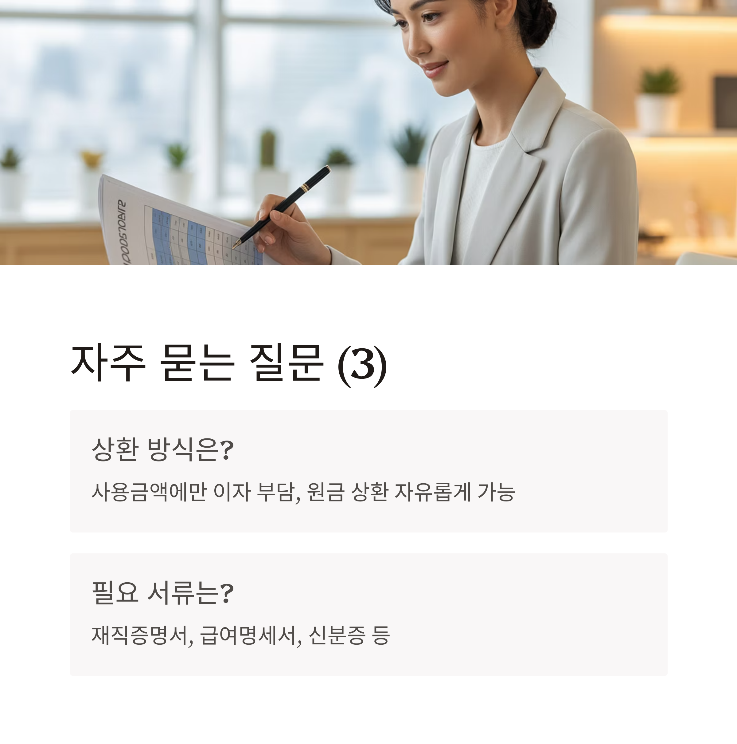 A8. 기본적으로 재직증명서, 급여명세서, 신분증 등이 필요하며, 대출 신청 시 별도 안내됩니다.