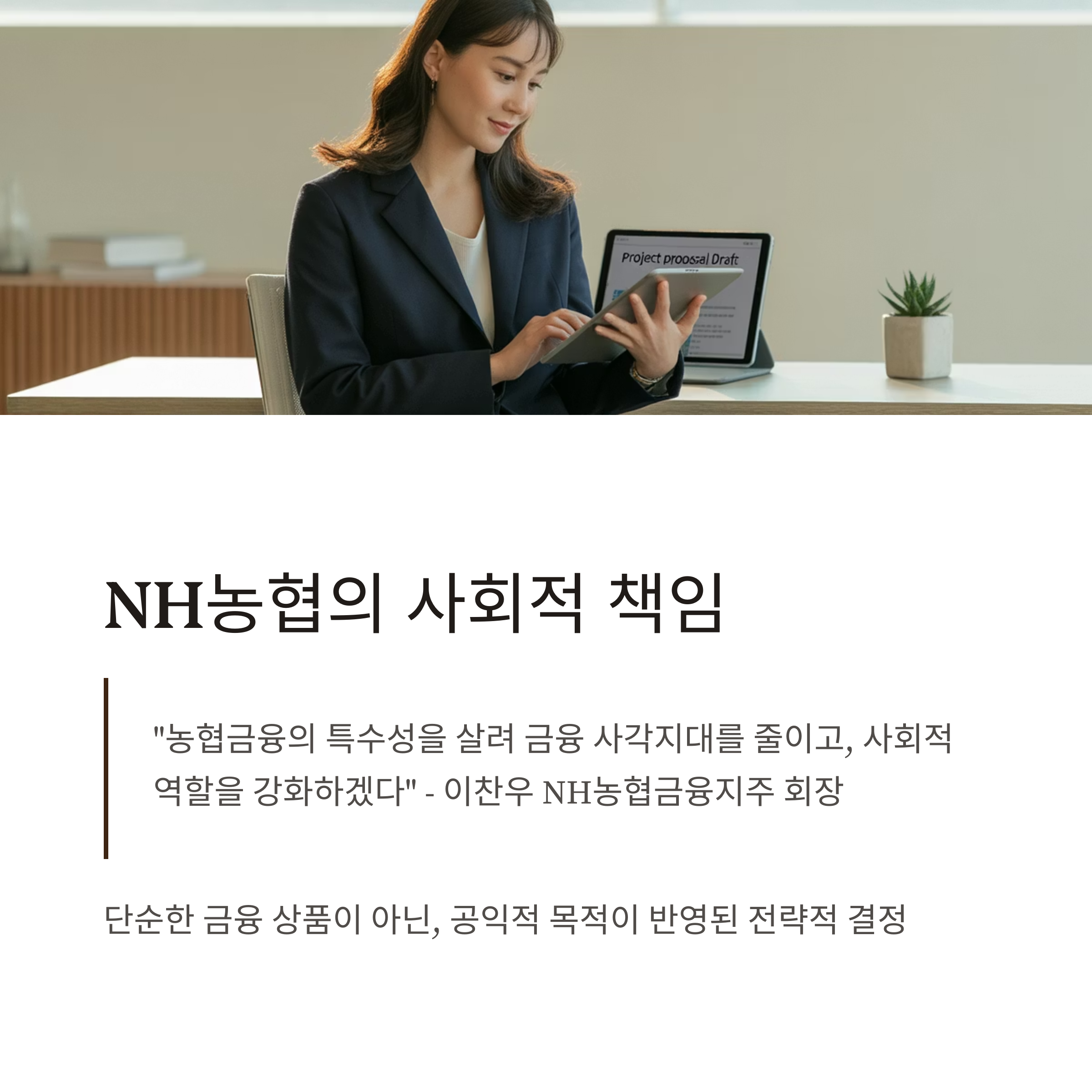 이찬우 NH농협금융지주 회장은 “농협금융의 특수성을 살려 금융 사각지대를 줄이고, 사회적 역할을 강화하겠다”고 밝힌 바 있습니다.