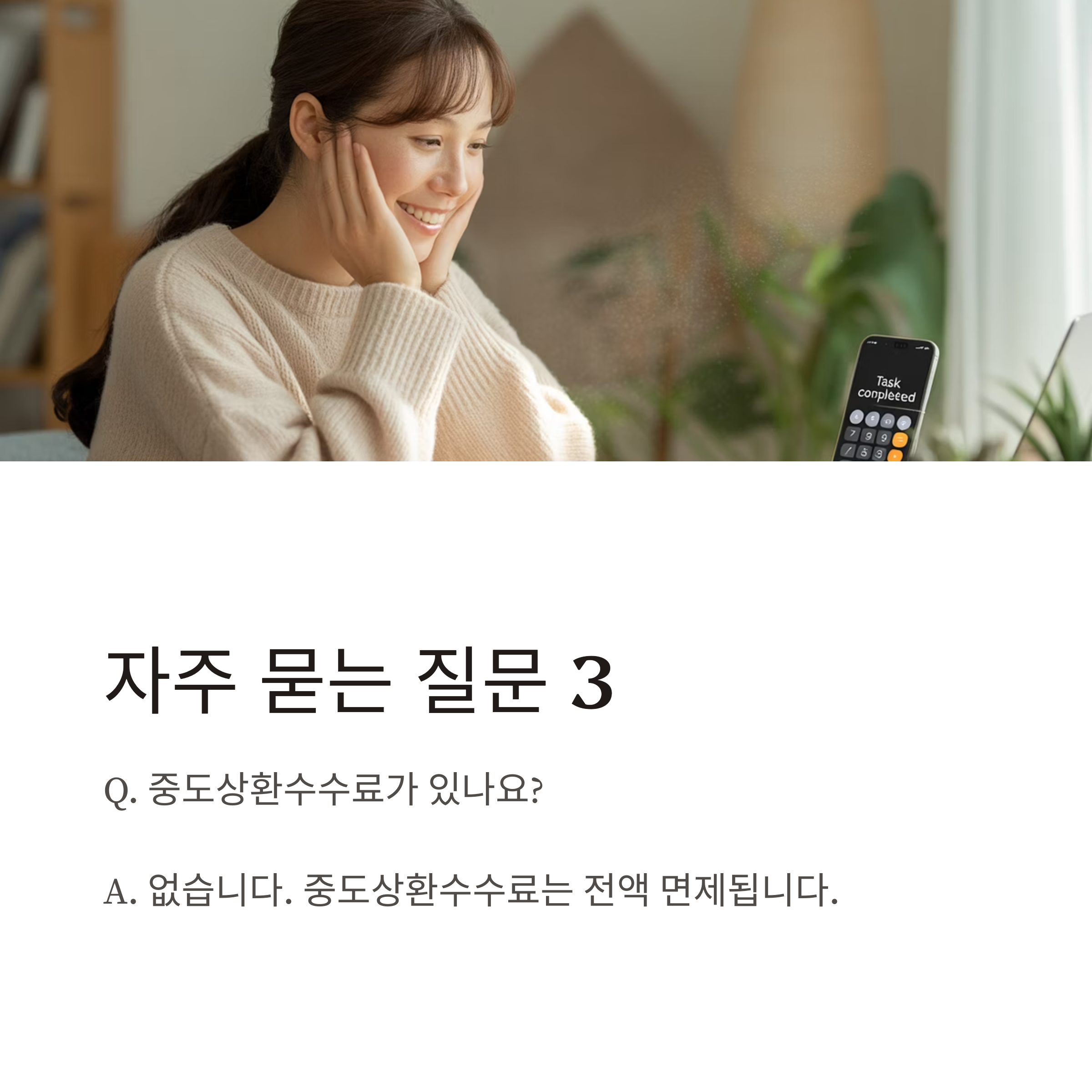A3. 없습니다. 중도상환수수료는 전액 면제되기 때문에 자유롭게 상환이 가능합니다.