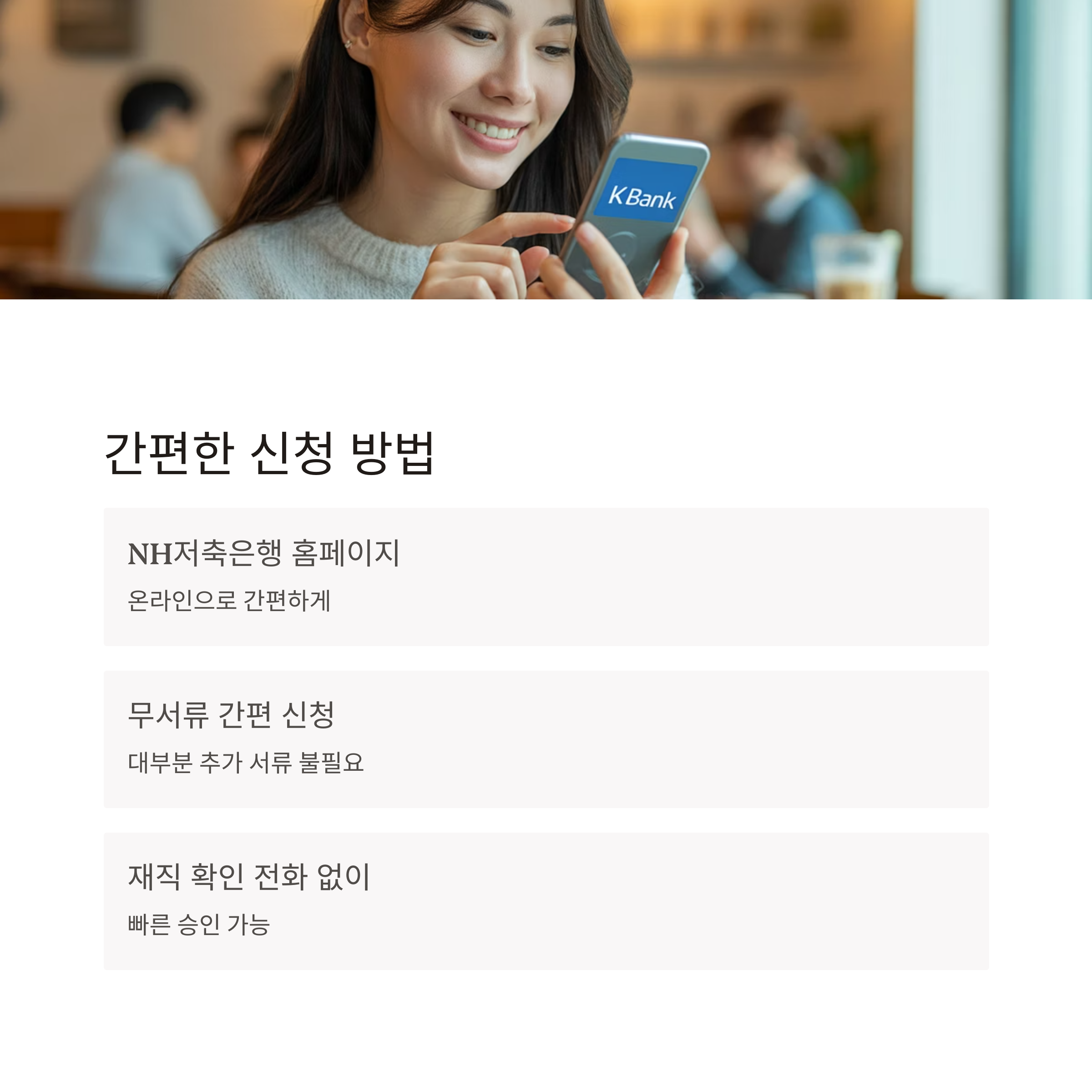 - ✔ 대부분의 고객은 재직 확인 전화 없이 승인
