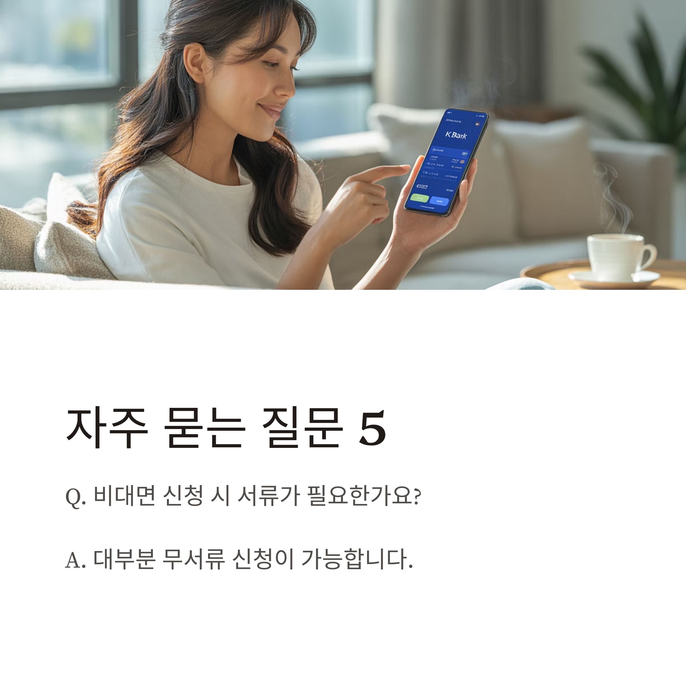 A5. 대부분의 경우 무서류 신청이 가능합니다. 다만, 일부 고객의 경우 확인 서류를 요청할 수 있습니다.