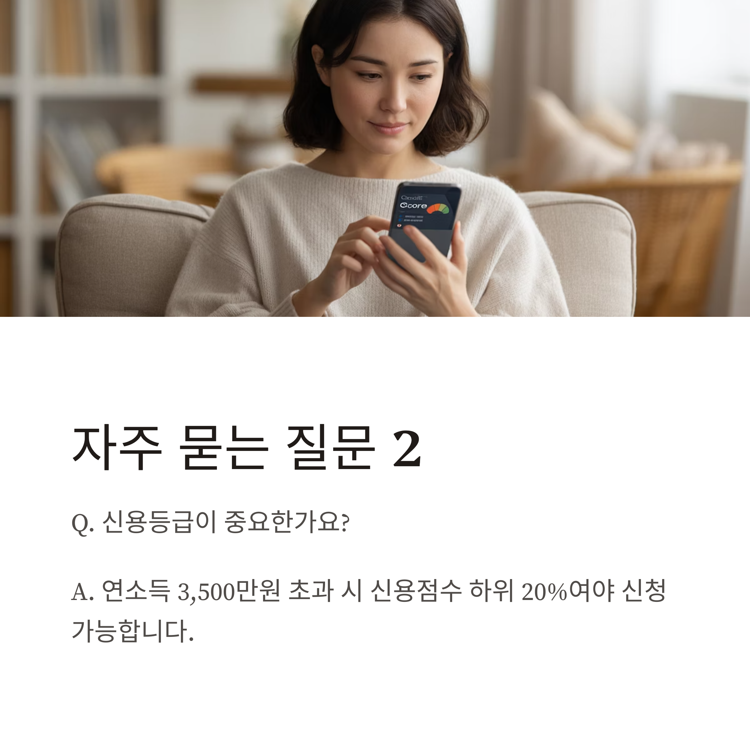 A2. 연소득이 3,500만 원 초과일 경우, 신용점수가하위 20%여야 신청이 가능합니다.