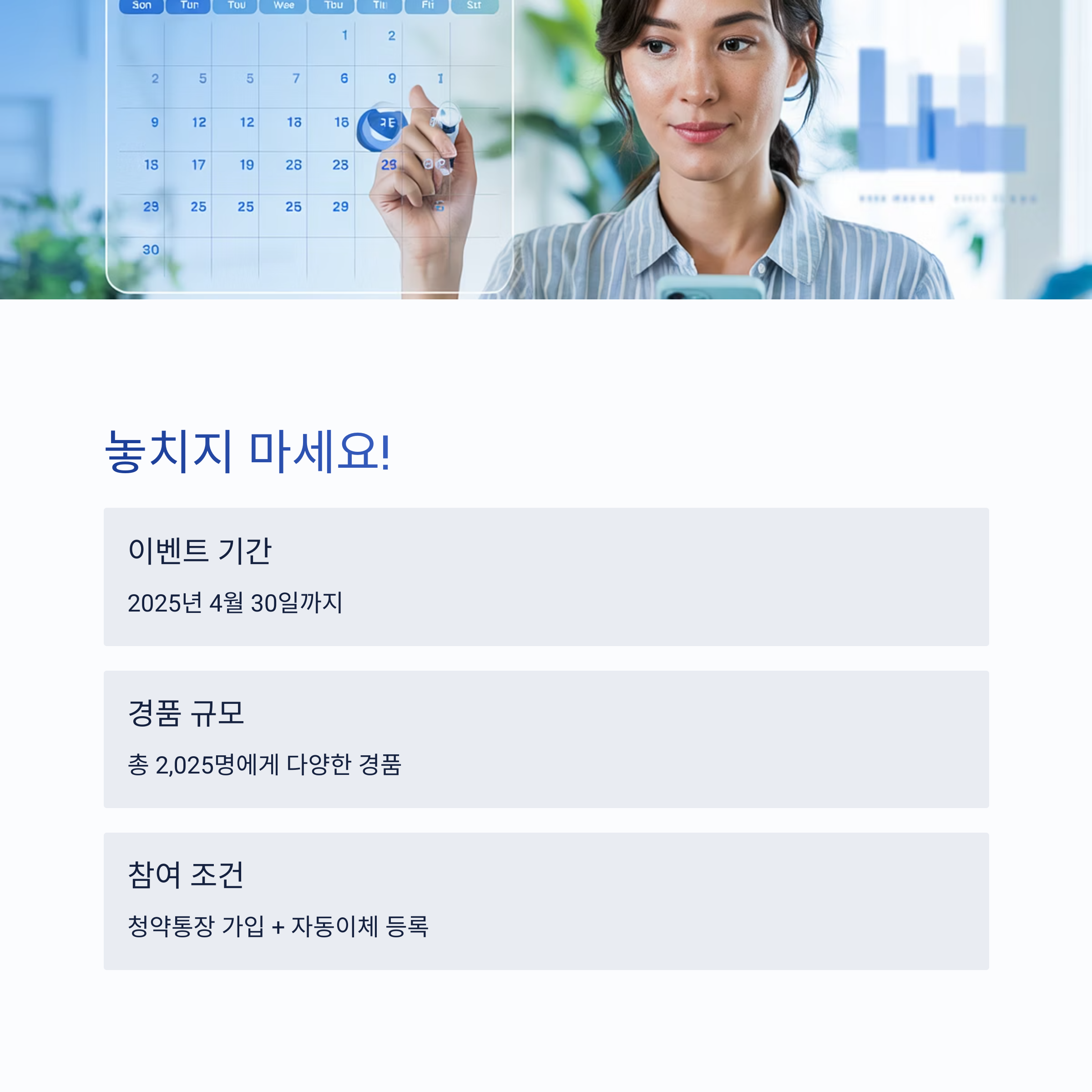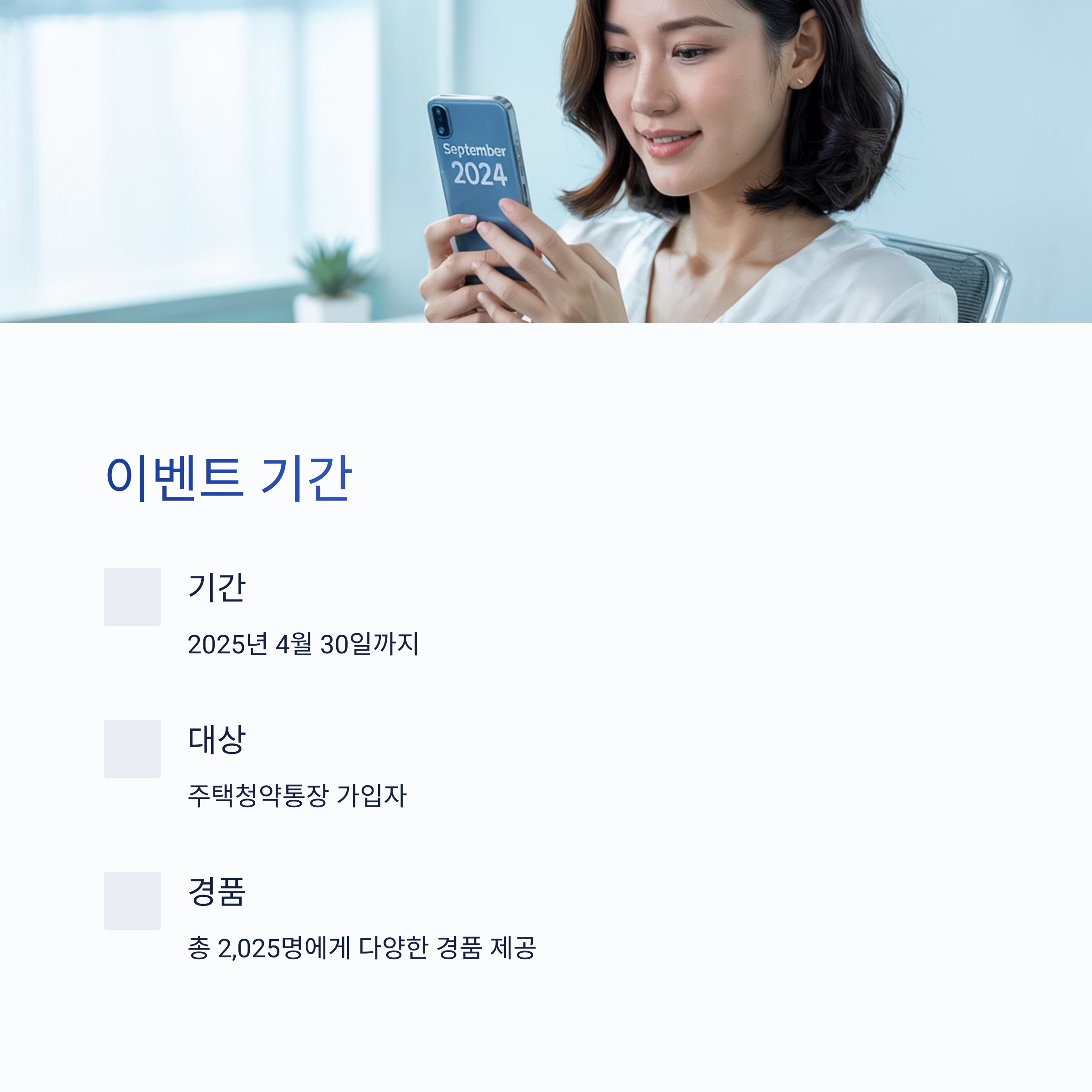 총 2,025명에게 경품을 제공하며, 청약통장만 가입해도 자동 응모가 가능합니다.