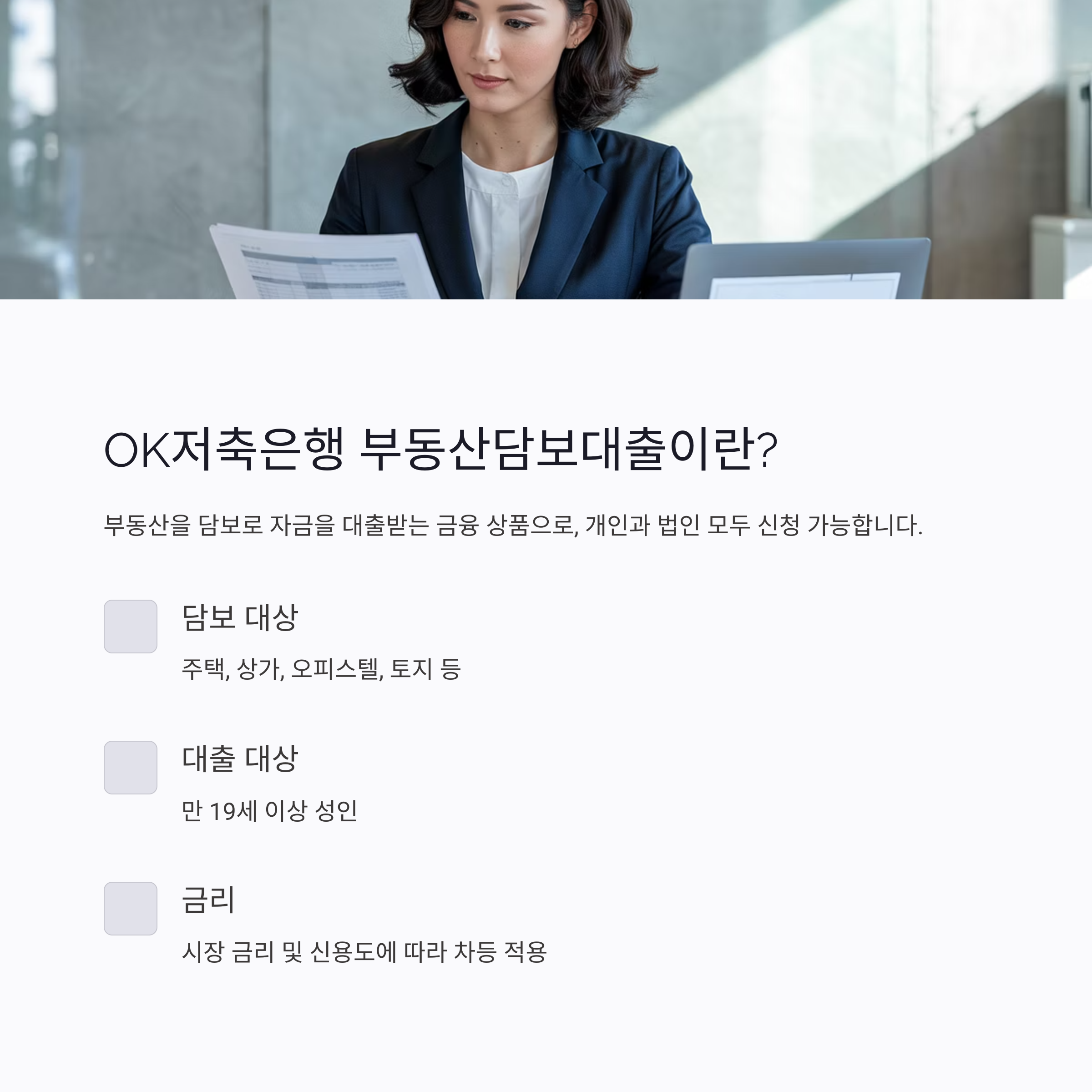 부동산을 담보로 활용해 대출을 받고자 한다면, OK저축은행 부동산담보대출은 꼭 살펴봐야 할 상품입니다. 이 대출은 주택, 상가, 오피스텔, 토지 등 다양한 부동산을 담보로 활용할 수 있어 활용도가 높고, 개인과 법인 모두 신청이 가능합니다. 이 글에서는 조건, 한도, 상환방식, 필요서류 등 핵심 정보를 정리해 드립니다.