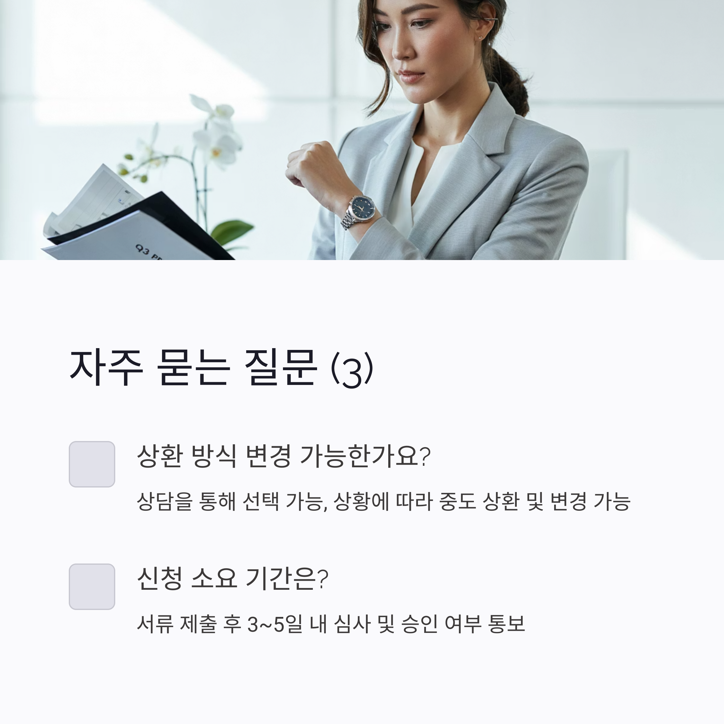 A5. 대출 실행 전 상담을 통해 상환 방식을 선택할 수 있으며, 상황에 따라 중도 상환 및 변경이 가능합니다.