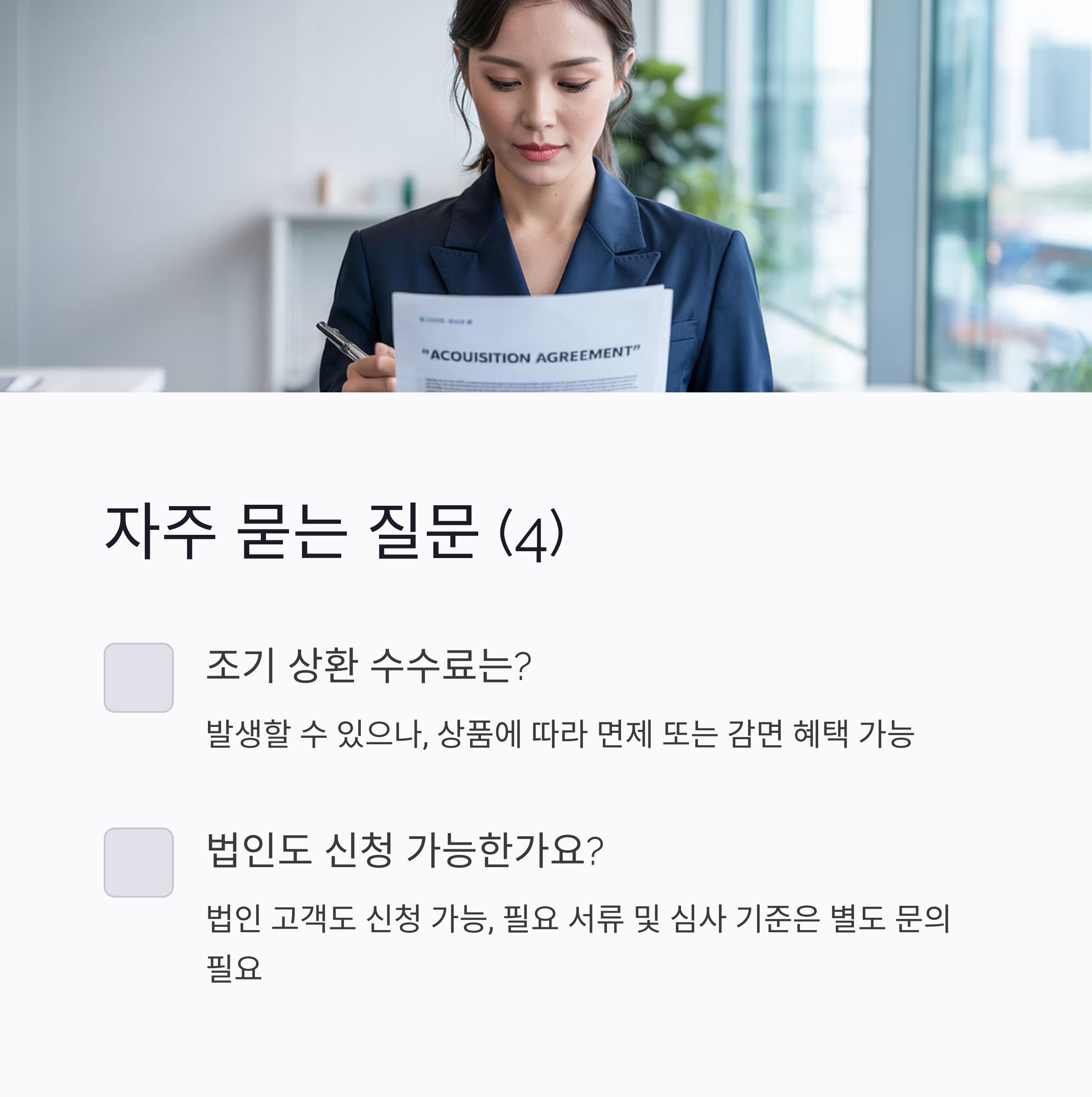 A8. 예, 법인 고객도 신청 가능하며, 필요 서류 및 심사 기준은 상이하니 별도 문의가 필요합니다.