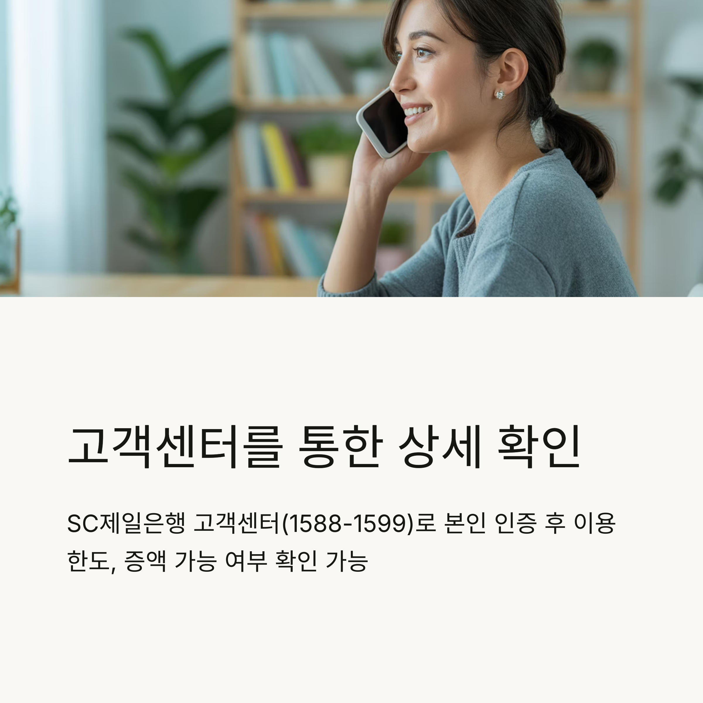 📞 SC제일은행 고객센터(1588-1599) 를 통해 본인 인증 후 이용한도, 증액 가능 여부를