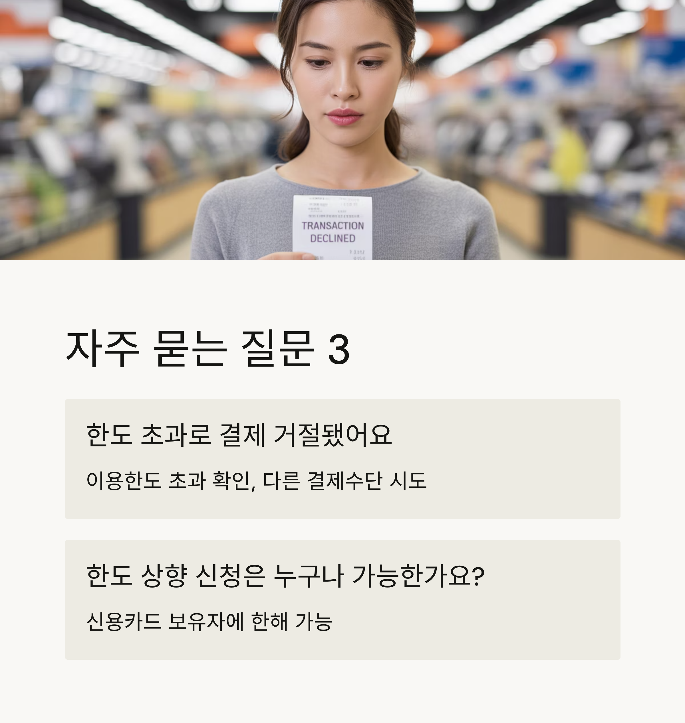 A5. 이용한도를 초과했는지 확인하고, 필요 시 다른 수단(다른 카드, 이체 등)으로 결제를 시도해야 합니다.