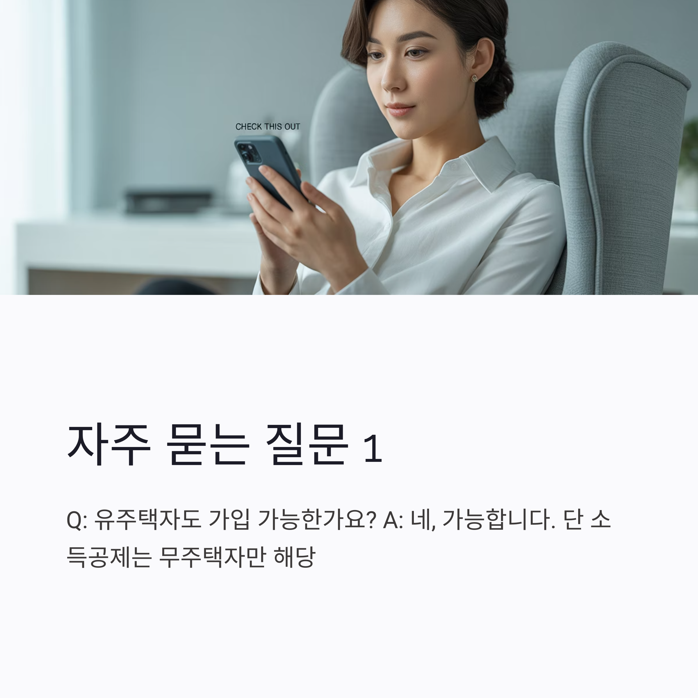 A1. 네, 유주택자도 가입 가능합니다. 다만 청약 소득공제 혜택은 무주택자만 받을 수 있습니다.